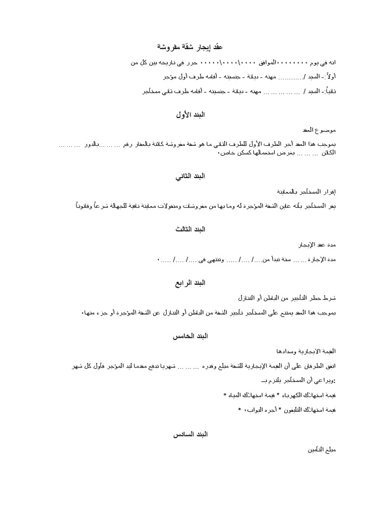 نموذج عقد ايجار شقة مفروشة Pdf Doc صيغة جاهزة للطباعة